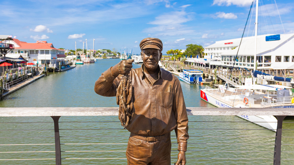 Located at a scenic point at the Shem Creek boardwalks is the Wayne Magwood Fisherman’s Statue. This statue is more than a photo stop, it’s a celebration of Mount Pleasant’s deep-rooted shrimping heritage and one of its most legendary champions. Captain Wayne Magwood was a lifelong fisherman whose passion for local seafood took him from the docks of Shem Creek to the halls of Washington, D.C., where he fiercely advocated for American shrimpers as President of the South Carolina Shrimpers Association, earning the state’s highest civilian honor, the Order of the Palmetto. His boat, Winds of Fortune, became an icon in its own right, famously spotlighted in commercials and media that helped shine a national light on the Lowcountry’s fishing way of life.